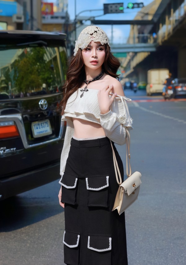 | Người đẹp chọn kết hợp giữa áo trễ vai ngắn khoe vòng eo thon, phối cùng váy đen với điểm nhấn là những chiếc túi hộp độc đáo. Để tạo thêm ấn tượng khi dạo phố, nàng hậu chọn nón đội đầu cách điệu và túi xách “tone sur tone” với màu áo, tạo nên một tổng thể hoàn chỉnh. |